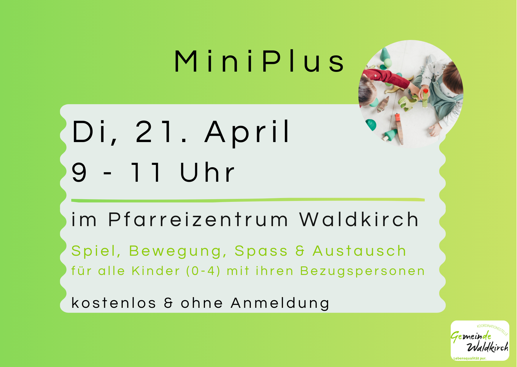 TPfarreizentrum, Dorfstrasse 24, Waldkirch UKfKG t9.00 - 11.00 Uhr uSuzana Golic esuzana.golic@waldkirch.ch FWebsite RFlyer JMiniPlus heisst alle Bezugspersonen mit Kindern ab Geburt bis Kindergarteneintritt herzlich willkommen. In entspannter Atmosphäre gibt es Zeit für Begegnung und Austausch sowie für gemeinsames Spielen, Bewegung und Spass.