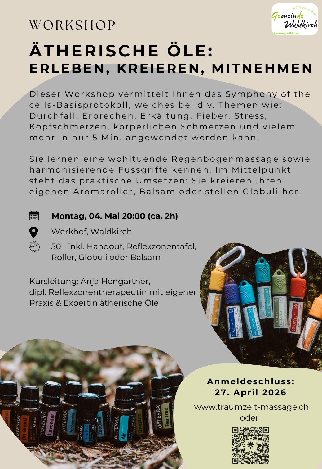 TWerkhof, Waldkirch UKfKG t20.00 Uhr uAnja Hengartner epraxis@traumzeit-massage.ch FWebsite RFlyer JDieser Workshop vermittelt Ihnen das Symphony of the cells-Basisprotokoll, welches bei div. Themen wie: Erkältung, Fieber, Stress, Kopfschmerzen, Durchfall, Erbrechen, körperlichen Schmerzen und vielem mehr in nur 5 Minuten angewendet werden kann. Sie lernen eine wohltuende Regenbogenmassage sowie harmonisierende Fussgriffe kennen. Im Mittelpunkt steht das praktische Umsetzen: Sie kreieren Ihren eigenen Aromaroller, Balsam oder stellen Globuli her. Kosten: 50.- inkl. Handout, Reflexzonentafel, Roller, Globuli oder Balsam Anmeldungen bis: 27. April 2026