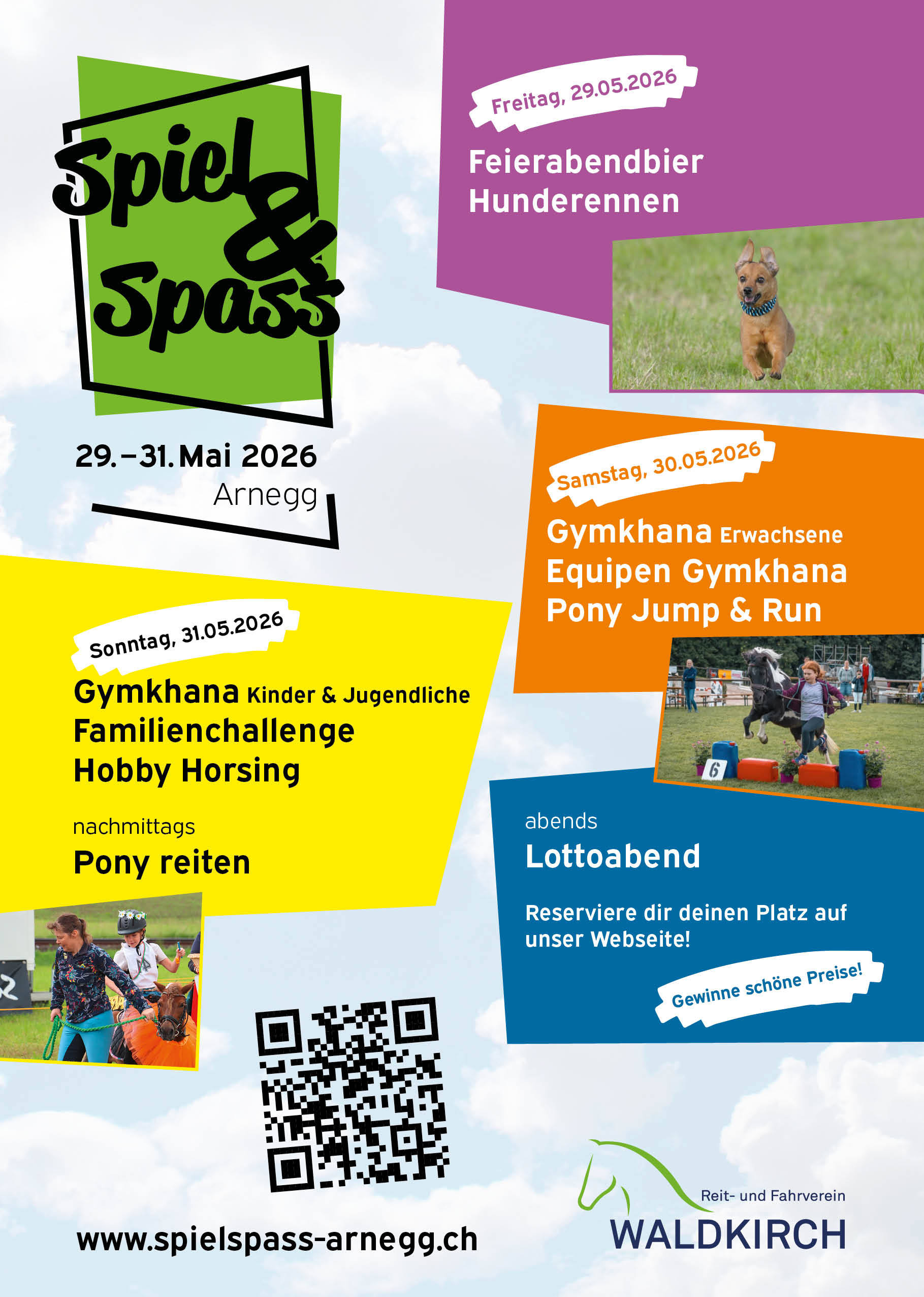 TArneggerwitistrasse 3877, 9212 Arnegg UReit- und Fahrverein Waldkirch tGemäss Informationen auf der Webseite uCéline Engetschwiler ec.engetschwiler@gmail.com FWebsite RFlyer JSpiel, Spass und gute Laune für alle! ???? Der Reit- und Fahrverein Waldkirch lädt bereits zum zweiten Mal zu diesem unvergesslichen Event ein. Freut euch auf eine grosse Festwirtschaft mit Barbetrieb und jede Menge Action. Ob Hunderennen, Lottoabend, Hobby Horsing, Ponyreiten, Geschicklichkeitsreiten oder viele weitere Highlights – hier kommt garantiert jede und jeder auf seine Kosten. Also: Freunde & Familie schnappen, vorbeikommen und mitfeiern! Wir freuen uns riesig auf euch! ????