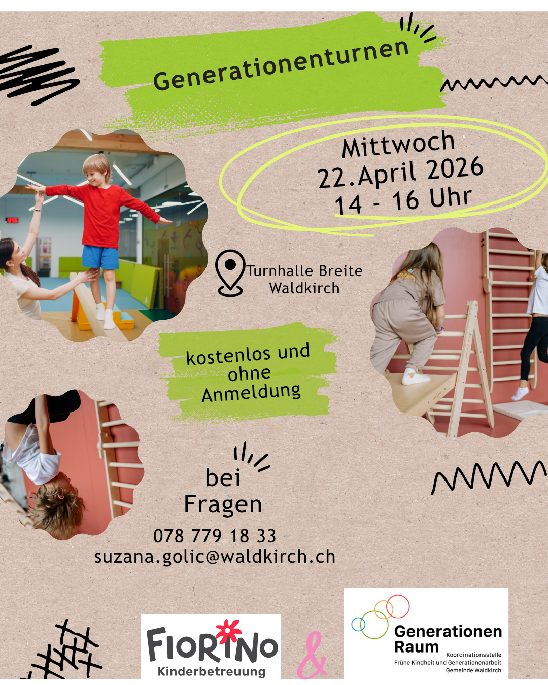 TTurnhalle Breite, Waldkirch UGenerationenRaum t14.30 - 16.00 Uhr uSuzana Golic esuzana.golic@waldkirch.ch FWebsite RFlyer JIn Zusammenarbeit mit der Kita Fiorino Waldkirch öffnen wir die Turnhallentüren. Am Mittwoch, 22. April bist du herzlich mit deinen Kindern eingeladen in der Turnhalle Breite herumzutoben und dich mit anderen Bezugspersonen auszutauschen. Der Turnnachmittag ist kostenlos und kann ohne Anmeldung besucht werden.