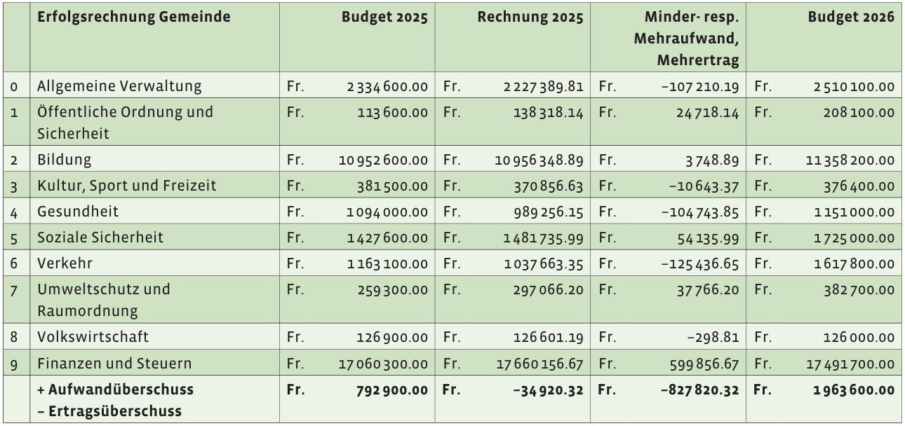 Das Budget 2026 weist bei der Erfolgsrechnung einen Ertragsüberschuss von Fr. 361'900.00 aus. Dies bei einem Gesamtaufwand von neu Fr. 5'232'100.00 (gegenüber dem Jahr 2025 mit Fr. 5'410'600.00) und einem budgetierten Ertrag von Fr. 5'594'000.00 (Vorjahr Fr. 5'413'700.00). Die Abschreibungsquote 2026 beträgt Fr. 490'000.00 (Vorjahr: Fr. 405'000.00).