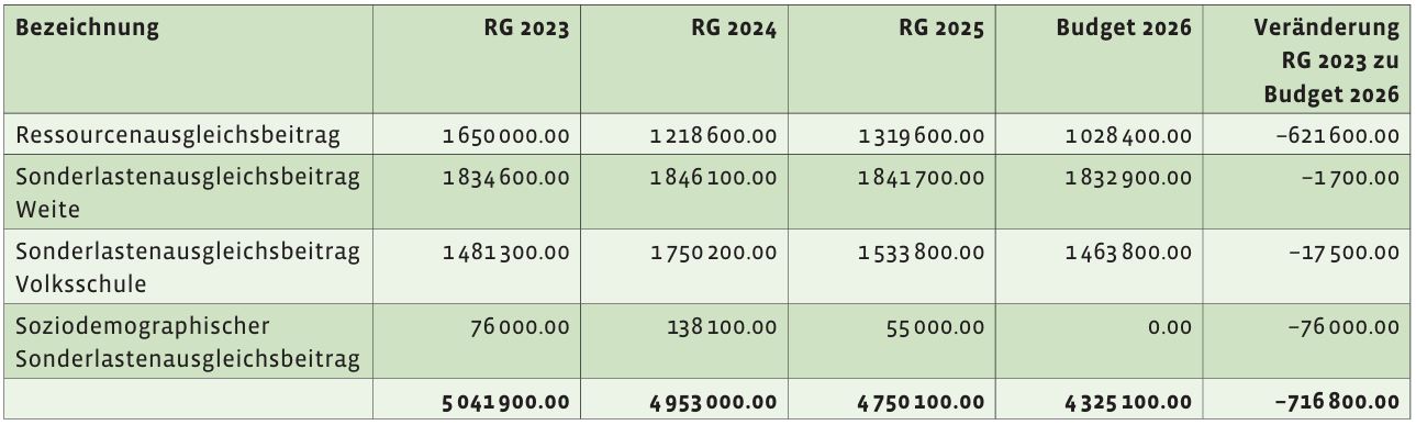Aus dem Finanzausgleich, im Speziellen aus dem Sonderlastenausgleichsbeitrag Volksschule, fällt der Gemeinde Fr. 216'400.00 weniger zu. Auch der soziodemographische Sonderlastenausgleichsbeitrag reduziert sich um Fr. 83'100.00.