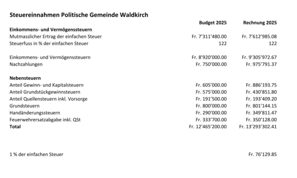 Die Details zu den Jahresabschlüssen 2025 und den Budgets 2026 der Politischen Gemeinde und der Technischen Betriebe werden wir Ihnen im Geschäftsbericht 2025 gerne erläutern. Dieser wird in den kommenden Tagen in alle Haushalte versandt und wie üblich auf unserer Website www.waldkirch.ch > Dienstleistungen > Berichte aufgeschaltet.
